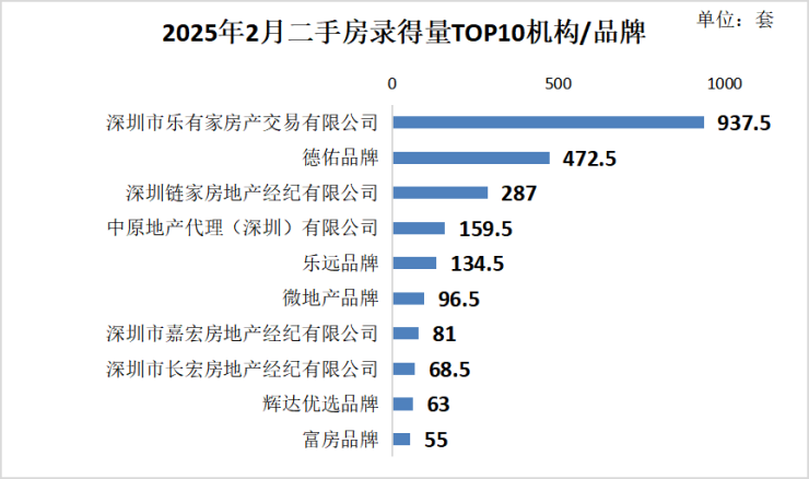 另据统计,以独立法人机构及加盟品牌为参考标准,2025年2月深圳市二手房录得量TOP10机构/品牌如下: