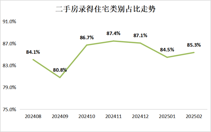 另据统计,二手房住宅类别成交占比小幅提升,2月二手房住宅类别录得量占比为85.3%,较上月上升0.8个百分点。