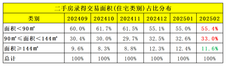 据统计,2月市场成交小于90平方米的房源占总量55.4%,较上月上升0.4个百分点。在“关于取消普通住房标准有关事项的通知”的政策带动下,2024年11月后大户型房源的成交占比明显提升,在此背景环境带动下,近期刚需性客户入市意愿也有小幅回升。
