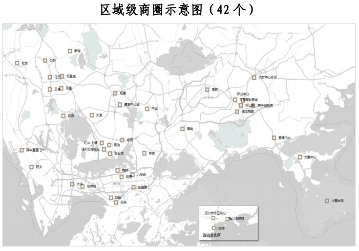 本次规划共划定 42 个区域级活力商圈,包含八卦岭商圈、大冲 商圈、石岩商圈、横岗商圈、民治商圈、坪山围商圈、光明中心区 商圈、葵涌中心商圈、深汕合作区核心商圈等