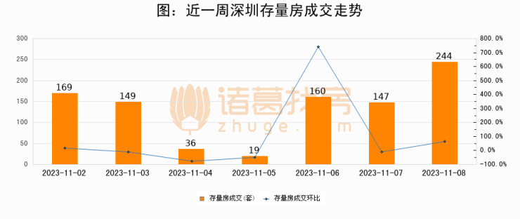 从存量房来看,2023年11月08日深圳存量房单日成交244套,比昨日增加97套,环比上涨66%。从近一周存量房成交来看,深圳存量房日均成交套数为132套,11月08日单日成交244套,高于近一周平均水平84.8%。