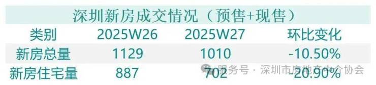 据深圳市房地产信息平台数据,2025年第27周全市新房(预售+现售)成交量下降明显。