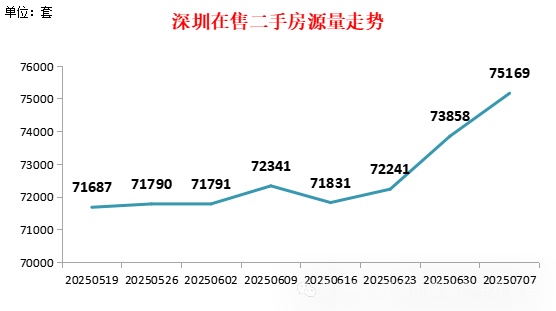 根据公开在售二手房源量数据统计,截至2025年7月7日,全市共有75,169套有效二手房源在售,较上周增加1,311套。其中龙岗较上周增加356套,有效在售19,439套,宝安较上周增加253套,有效在售13,783套,福田较上周增加212套,有效在售10,608套。