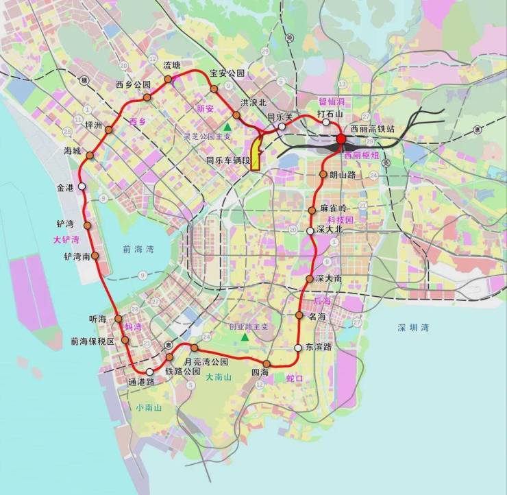 地铁15号线 作为第五期建设规划中的首条地铁线路,也是串联前海、南山和宝安中心区的首条环线线路,线路起自听海站,止于听海站,全长 32.2 km,设站 24 座。
