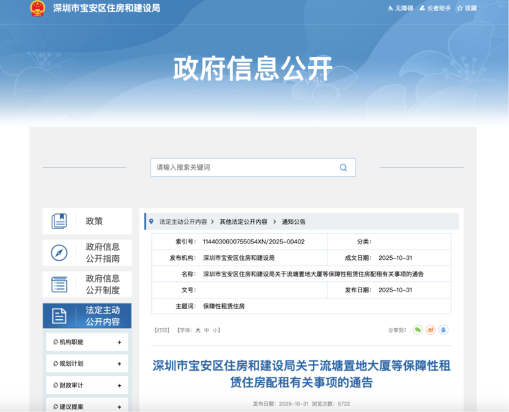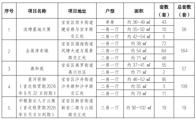 宝安区住房和建设局日前发布关于流塘置地大厦等保障性租赁住房配租有关事项的通告,据悉,本次配租共5个项目427套房源,主要向注册地位于项目所在街道的重点企业以及学校、医院等机关事业单位配租,认租时间为2025年11月3日至11月12日。
