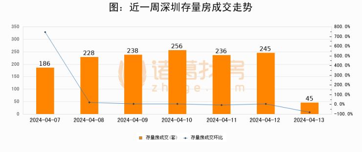 从存量房来看,2024年04月13日深圳存量房单日成交45套,比昨日减少200套,环比下降81.6%。从近一周存量房成交来看,深圳存量房日均成交套数为204套,04月13日单日成交45套,低于近一周平均水平77.9%。