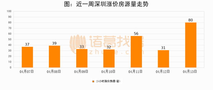 根据诸葛找房数据显示,深圳24小时涨价房源量为80套,较04月12日增加49套,环比上涨158.1%。与此同时,涨价房源占比小幅扩大,业主信心有所提升。