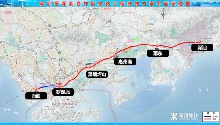 深汕高铁建设里程56公里,项目起于深圳枢纽西丽站,经深圳市南山、龙华、罗湖、 龙岗、坪山等区,沿线设西丽、罗湖北、坪山、惠州南、惠东、深汕共计6个车站。进入惠州市境内至深汕合作区,而后引入广汕铁路赤石站(深汕铁路引入后称“深汕站”),再利用广汕铁路至汕尾。