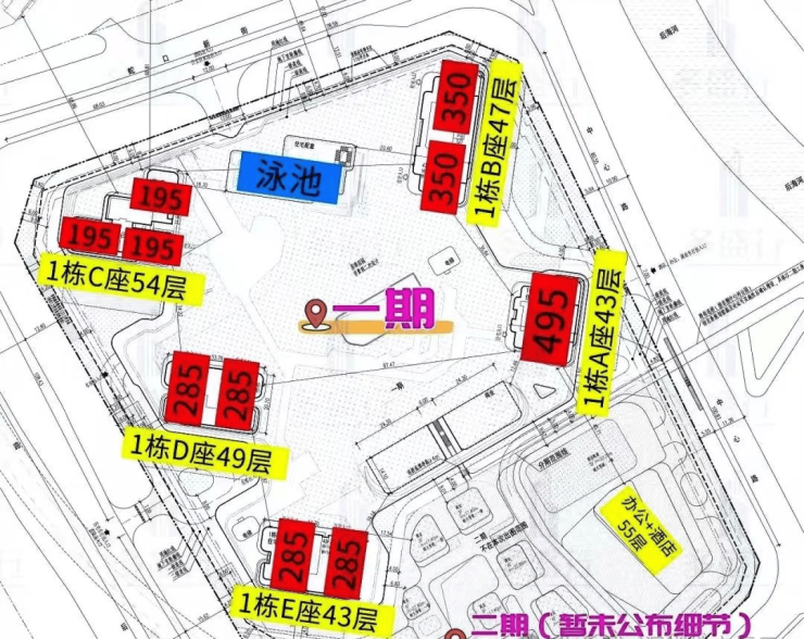 一期主推住宅:共约419套,含约195㎡、约285㎡、约350㎡、约495㎡四大户型,层高43-54层,梯户比最高达3梯1户。(户型数据均仅供参考,以开发商公布数据为准。)