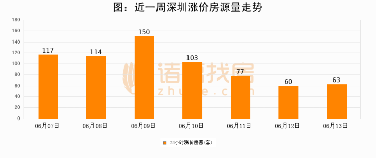 根据诸葛找房数据显示,深圳24小时涨价房源量为63套,较06月12日增加3套,环比上涨5%。与此同时,涨价房源占比小幅扩大,业主信心有所提升。