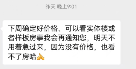现场销售也发来提醒没有价格、没有样板间,“不用着急过去看”