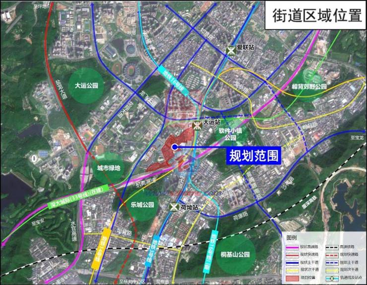 更新单元位于龙岗区园山街道荷坳社区,紧邻四轨交汇的大运综合交通枢纽。项目范围北邻龙飞大道,东临龙岗大道,南临机荷高速,西邻红棉路。