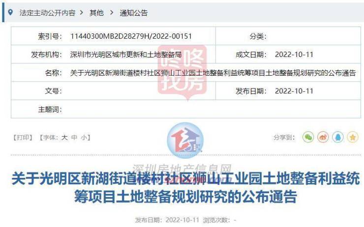 10月11日,光明区城市更新和土地整备局发布《光明区新湖街道楼村社区狮山工业园土地整备利益统筹项目土地整备规划研究的公布通告》。