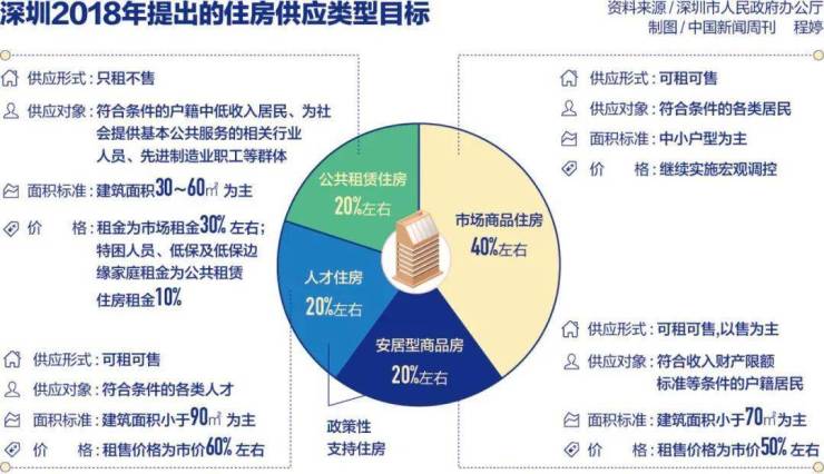 2018年,深圳开启“二次房改”,提出了一个雄心勃勃的目标:到2035年筹建各类住房170万套,其中带有政策支持性的住房总量不少于100万套,占市场供应量的60%左右。届时,深圳将形成商品房占40%,人才住房、安居型商品房和公共租赁住房各占20%的住房结构,后三种住房便属于“保障房”。