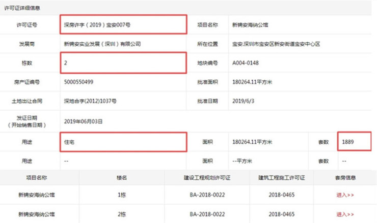 6月3日,位于宝安中心区N6区的新锦安海纳公馆获得预售,根据深圳市规土委的备案系统显示,新锦安海纳公馆此次备案的为1栋A/B/C/D/E/F座与2栋A/B座房源,本次共备案1889套房源,均为住宅产品。
