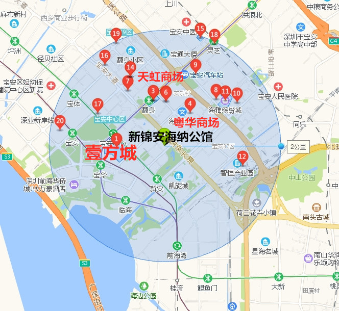 新锦安海纳公馆为新锦安壹号公馆的二期产品,位于宝安中心区N6区宝安大道和甲岸路交汇处,建筑面积约202337㎡,临近地铁1/5号线地铁口,轨道交通便利。项目距离壹方城商圈1.1公里,步行约15分钟。除此之外项目周边2公里范围内还有数十个商场,包括天虹商场、永旺超市、沃尔玛等完全可以满足不同人群的消费需求。