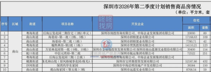 具体来看,南山区二季度计划入市的住宅项目包括后海沄玺花园二期、海晏府、翰熙典居、万星林花园、中信元湾府、珠光和山悦、深湾玖序东家园、观山海家园等。