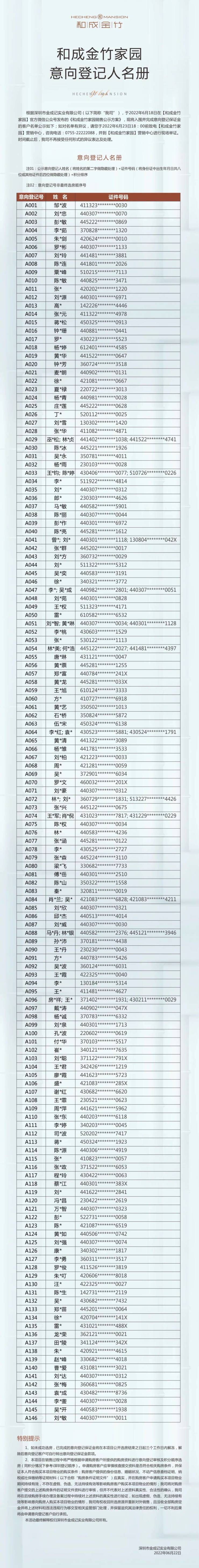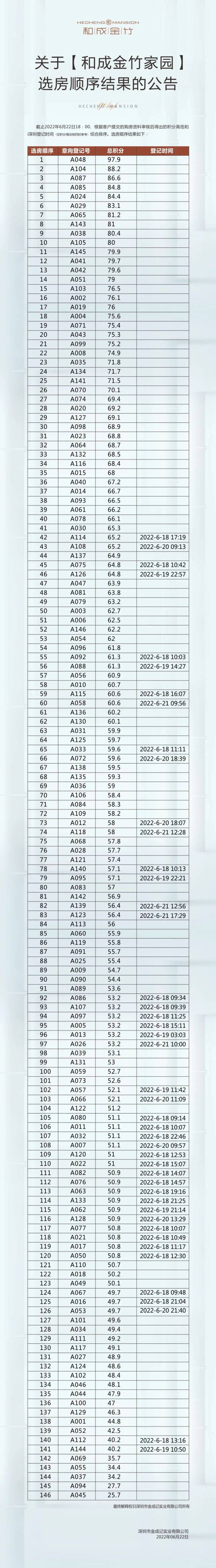 6月22日凌晨,龙岗坂田新盘和成金竹家园发布诚意登记名册和选房顺序结果公告,共登记146批客户。项目将根据积分排序选房,6月24日,9:30正式选房。