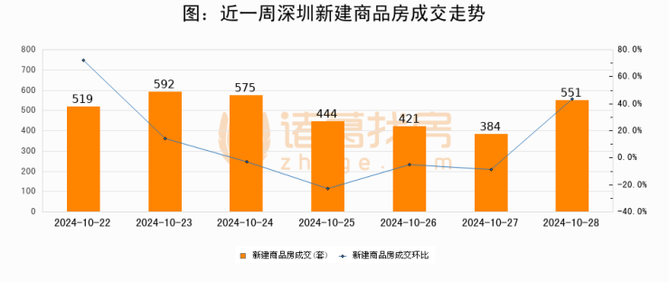 根据深圳市住房和城乡建设局数据显示,2024年10月28日深圳新建商品房成交551套,较昨日增加167套,环比上涨43.5%