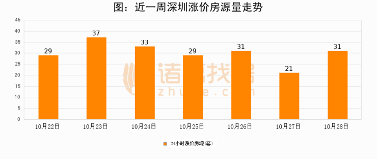 根据诸葛找房数据显示,深圳24小时涨价房源量为31套,较10月27日增加10套,环比上涨47.6%。与此同时,涨价房源占比小幅扩大,业主信心有所提升。