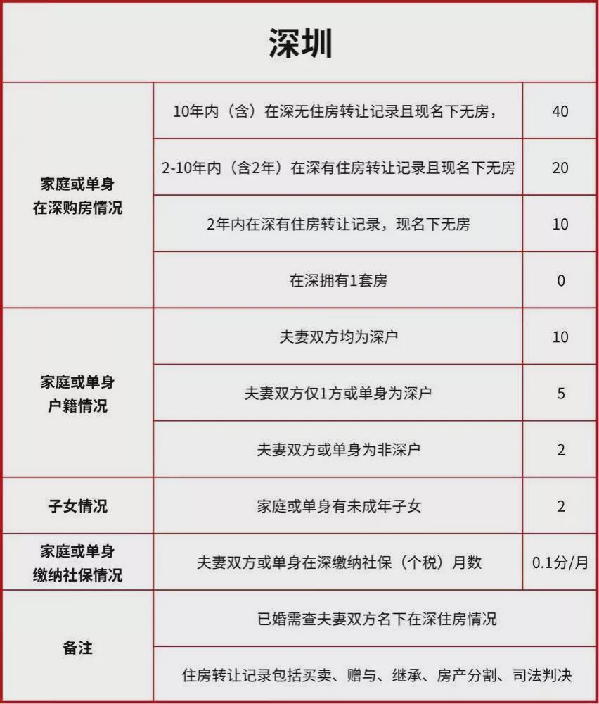 根据“计分规则”,10年内在深无住房转让记录且明显无房,得40分。这对于无房首套的刚需,基本上是必得的分数。如果以家庭为单位,双方是深户,家中有未成年子女,还可以加12分。也就是说,此类购房者可拿下基础分满分52分。