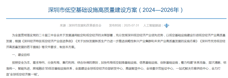 7月31日,深圳市发改委发布了深圳市低空基础设施高质量建设方案(2024—2026年)。