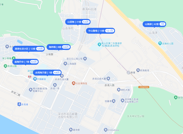 二手房方面,赤湾片区的二手房挂牌价多在8-12万/㎡。