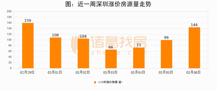 根据诸葛找房数据显示,深圳24小时涨价房源量为144套,较03月05日增加45套,环比上涨45.5%。与此同时,涨价房源占比小幅扩大,业主信心有所提升。