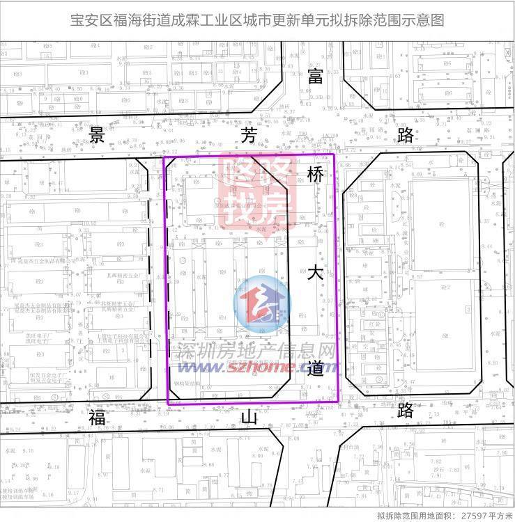 宝安区福海街道成霖工业区城市更新单元位于景芳路与规划在建富桥大道交汇处西南侧,拟拆除范围用地面积为27597平方米。深圳成霖实业有限公司来文申请将该更新单元纳入城市更新单元计划。