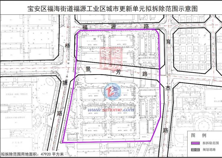 宝安区福海街道福源工业区城市更新单元位于福海街道,西侧为桥塘路,东侧为育杰路,北侧邻福源路,拟拆除范围用地面积为47920平方米。
