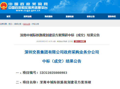 公告显示,深南中城际铁路规划建设方案预研项目被中铁第五勘察设计院集团有限公司和深圳国家高技术产业创新中心以168.1万元中标。