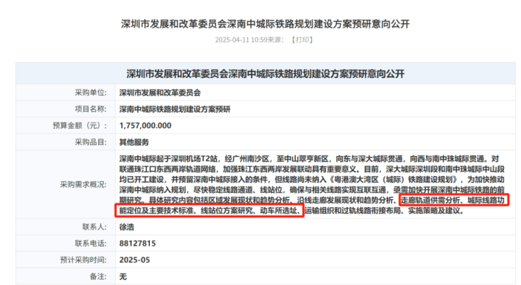 8月29日深圳公共资源交易中心发布的《深南中城际铁路规划建设方案预研(A)招标公告》显示,该项目招标预算175.7万元,重点研究线站位规划、系统制式及投融资方案,为纳入大湾区城际铁路建设规划奠定基础。