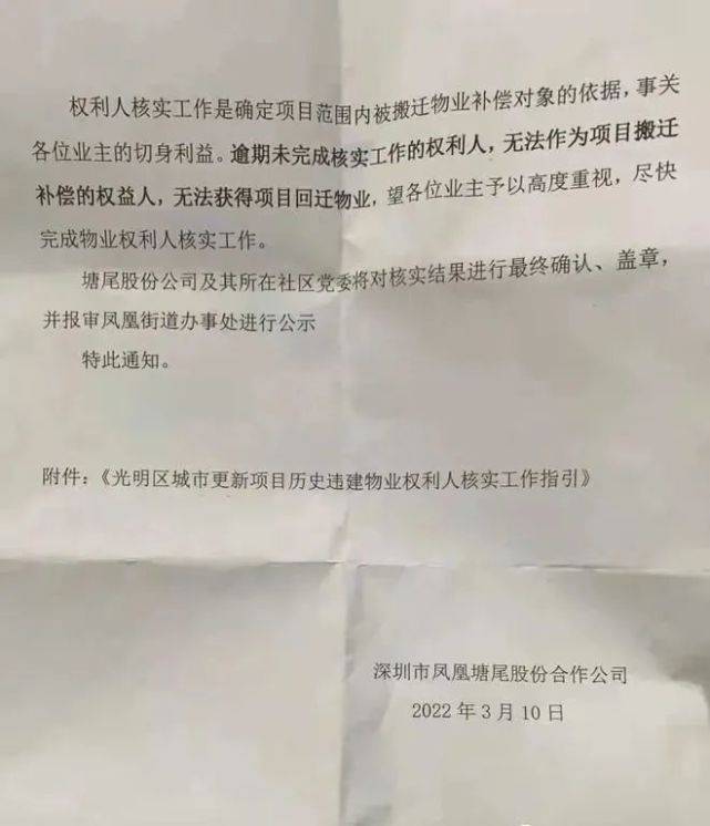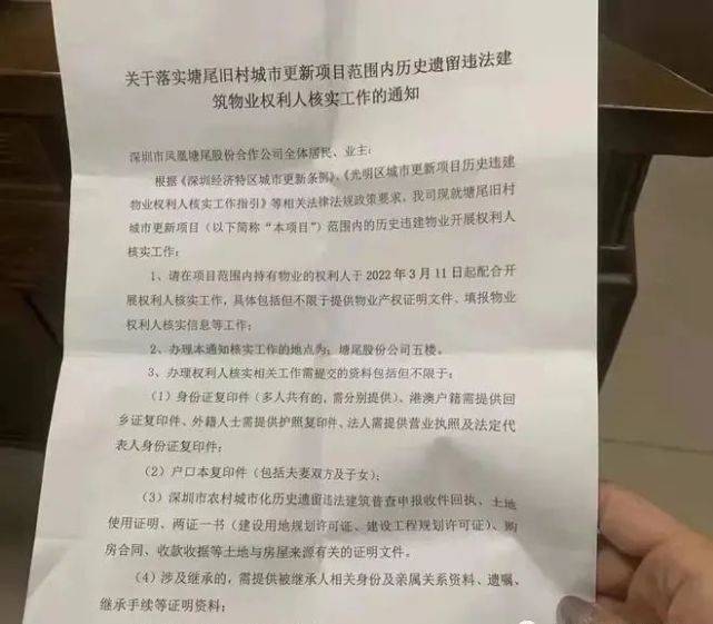 据网友爆料,光明凤凰塘尾旧村城市更新项目即将启动签约,目前已开始拆迁范围内历史违法建筑物业权利人核实工作。