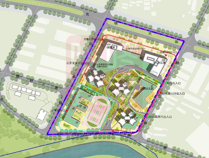 项目共规划5栋超高层建筑,包括3栋33-49F超高层住宅楼,1栋40F保障房,1栋39F写字楼以及1座12班幼儿园、1座18班小学。