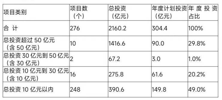 按资金来源划分,政府投资项目130个,总投资约317.3亿元,年度计划投资约57.1亿元,占全部项目年度计划投资的19.0%;社会投资项目146个,总投资约1842.9亿元,年度计划投资约247.3亿元,占全部项目年度计划投资的81.0%。