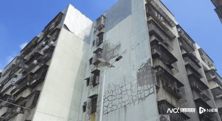 红岗花园部分楼栋外墙开裂、水泥块掉落,顶端用铁皮围住。
