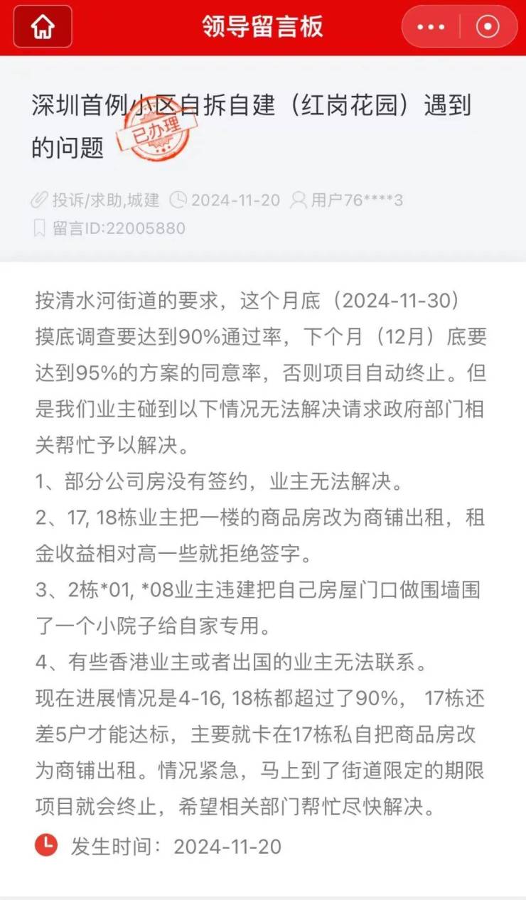 近日,奥一新闻从人民网留言板留意到,有市民对“深圳首例本区自拆自建(红岗花园)遇到已办理的问题”进行留言,他指出,若到本月底该项目方案还无法达到95%的同意率,项目或将自动终止。面对尚未达标的同意率,市民向有关部门进行求助,对此,罗湖区清水湖街道城市建设办公室进行回复:项目推进需要小区全体业主的支持与配合,如项目推进过程中遇到存在抵触情绪的业主,也需要由业主代表发挥带头作用,积极沟通,必要时相关政府部门亦会介入提供政策宣讲等协助。