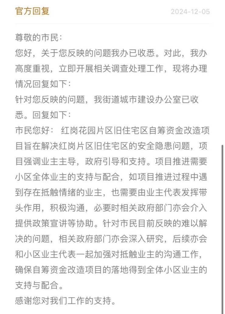 针对市民目前反映的难以解决的问题,相关政府部门亦会深入研究,后续亦会和小区业主代表一起加强对抵触业主的沟通工作,确保自筹资金改造项目的落地得到全体小区业主的支持与配合。