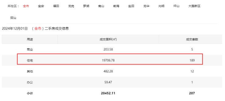 2024年12月1日二手房住宅网签189套。其中,宝安28套;福田37套;龙岗28套;罗湖24套;南山44套;盐田5套;龙华14套;坪山3套;光明5套;大鹏1套。
