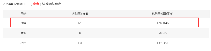 2024年12月1日新房住宅认购网签123套。其中,宝安43套;福田0套;龙岗16套;罗湖5套;南山8套;盐田0套;龙华25套;坪山14套;光明12套;大鹏0套;深汕0套。