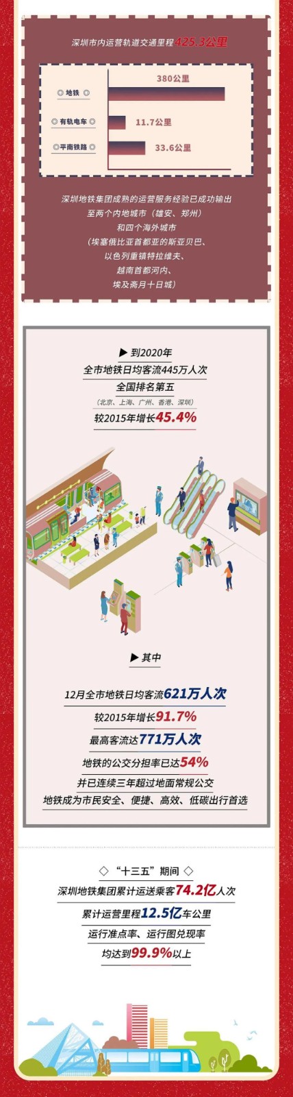 到2020年全市地铁日均客流445万人次,全国排名第五(北京、上海、广州、香港、深圳),较2015年增长45.4%。