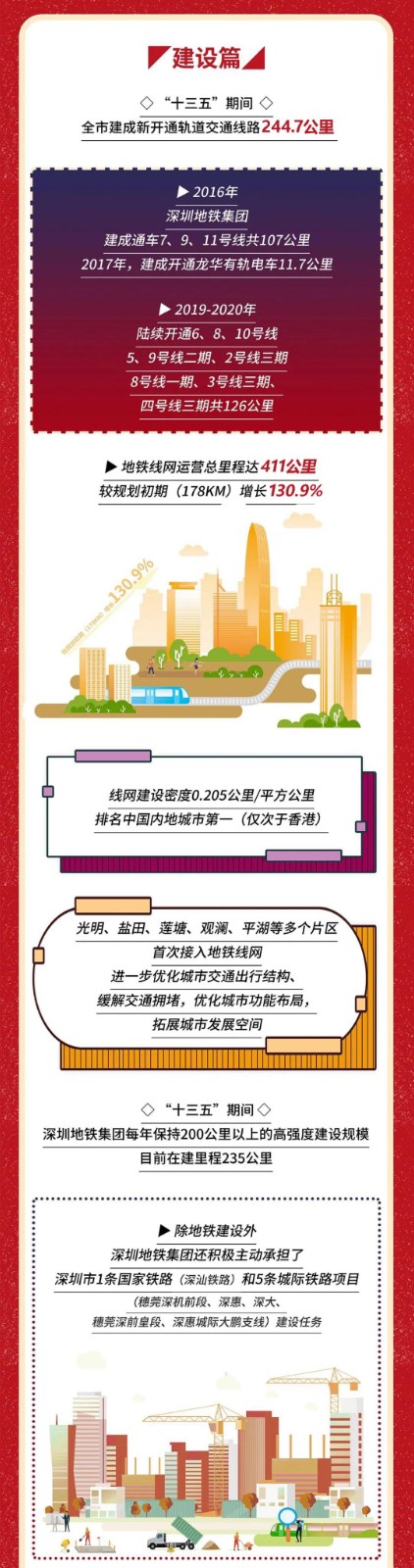十三五期间,深圳地铁集团每年保持200公里以上的高强度建设规模,目前在建里程235公里。