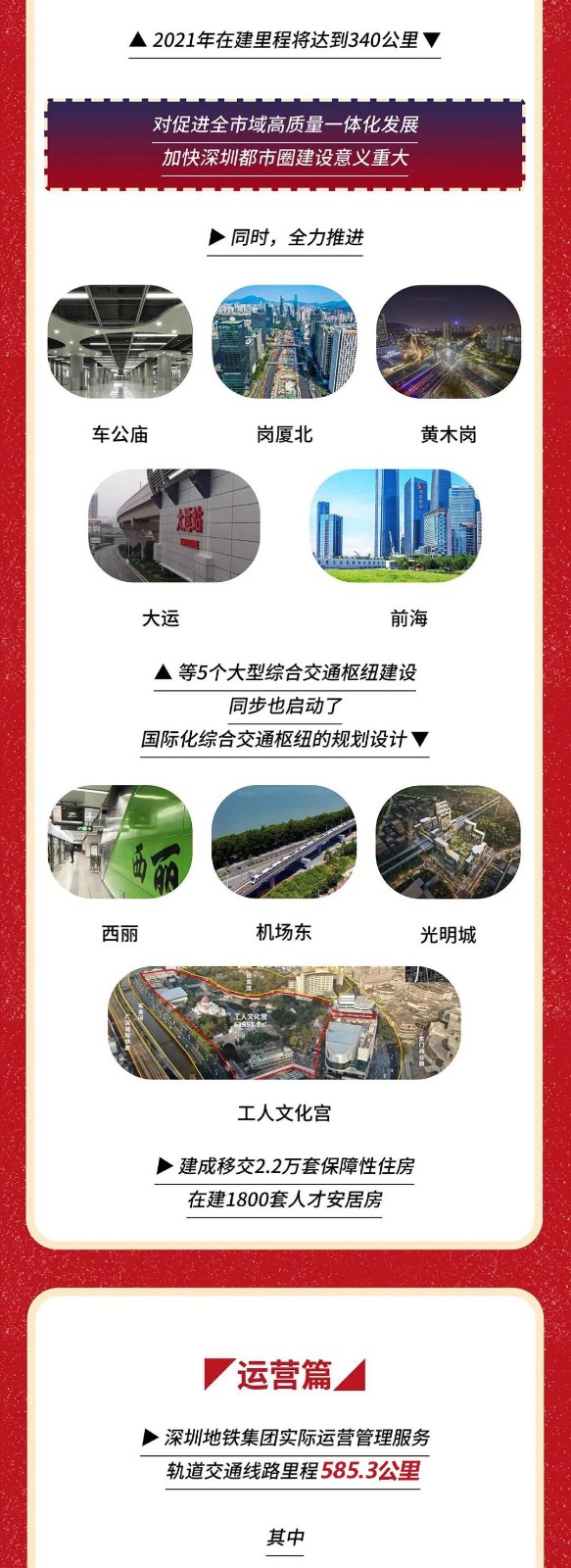 2021年,深圳地铁在建里程将达到340公里,同时全力推进车公庙、岗厦北、黄木岗、大运、前海等5个大型综合交通枢纽建设,同步也启动了国际化综合交通枢纽的规划设计。