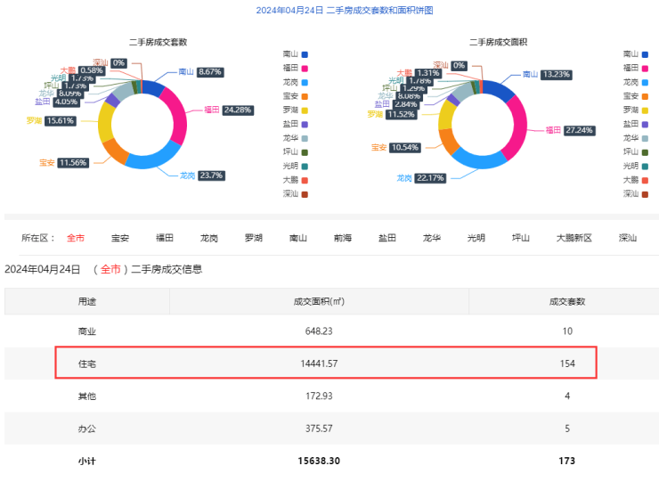 2024年4月24日二手房住宅网签154套。宝安19套;福田35套;龙岗38套;罗湖24套;南山14套;盐田4套;龙华14套;光明3套;坪山2套;大鹏1套。