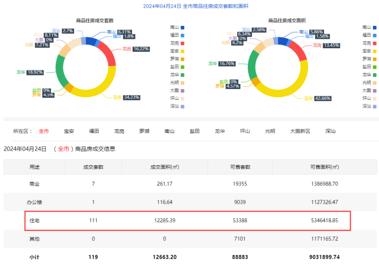 2024年4月24日新房住宅共网签111套。宝安38套;福田2套;龙岗18套;罗湖5套;南山7套;盐田0套;龙华21套;坪山9套;光明8套;大鹏0套;深汕3套。
