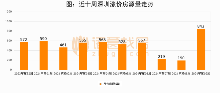 从调价房源来看,第8周深圳涨价房源843套,较上周上涨343.7%。与此同时,8周涨价房源占比回落14.51个百分点,业主信心小幅波动,购房者可则需入市。