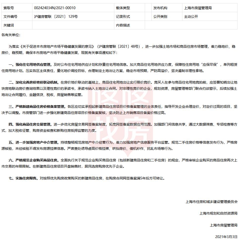 优先政策新房限售5年!上海发布楼市新政!