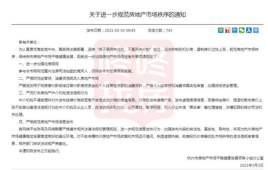 今天上午,杭州市房地产市场平稳健康发展领导小组办公室发布《关于进一步规范房地产市场秩序的通知》,规范房地产市场秩序,促进该市房地产市场平稳健康发展。