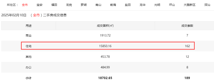2025年2月10日二手房住宅网签162套。其中,宝安25套;福田29套;龙岗38套;罗湖17套;南山25套;盐田3套;龙华20套;坪山3套;光明1套;大鹏1套。