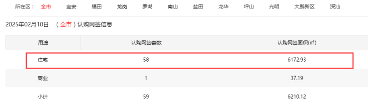 2025年2月10日新房住宅认购网签58套。其中,宝安7套;福田22套;龙岗10套;罗湖5套;南山3套;盐田1套;龙华4套;坪山1套;光明5套;大鹏0套;深汕0套。